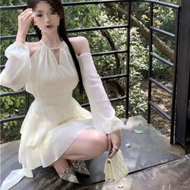 ホルターネックとシースルーの長袖が女性らしさを演出し、ウエストマークでスタイルアップ効果も抜群です。