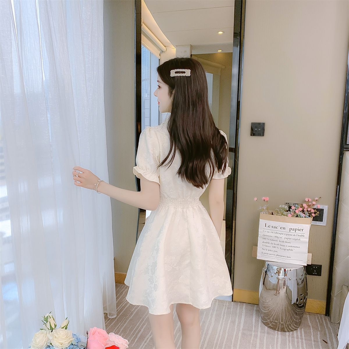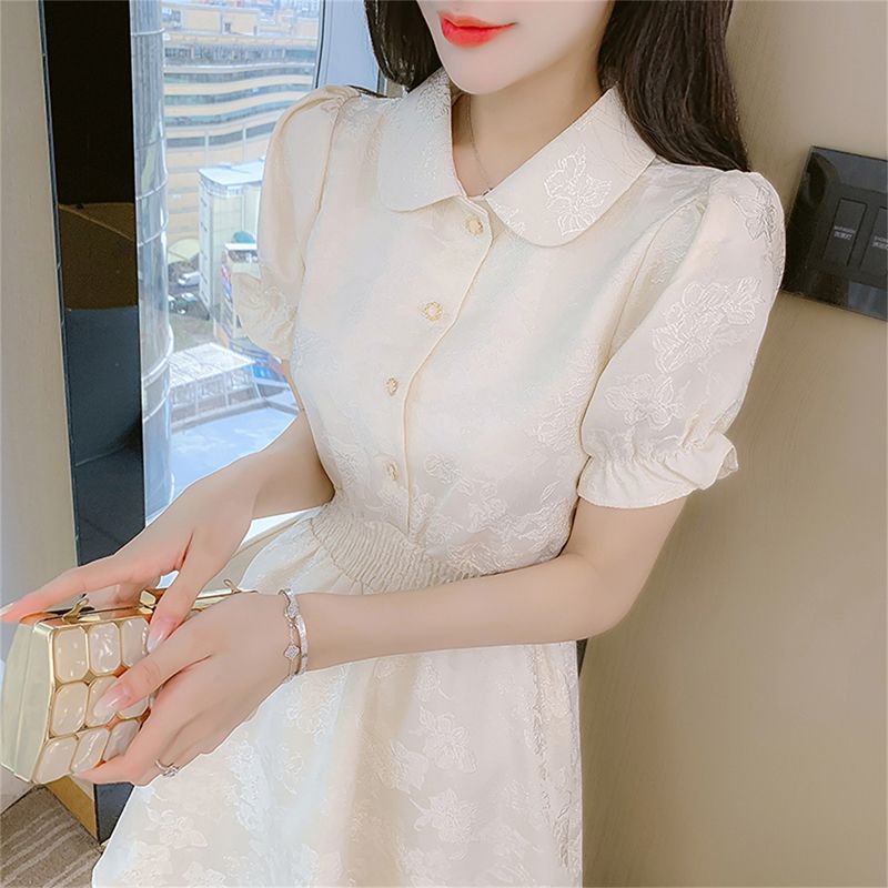 パフスリーブのデザインが二の腕を華奢に見せ、ウエスト部分のシャーリングがスタイルアップ効果を演出します。