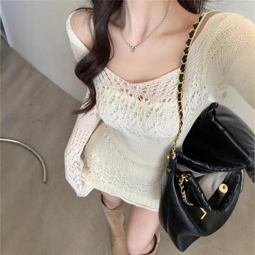 胸元と袖に施された透かし編みデザインが上品で華やかな印象を演出します。