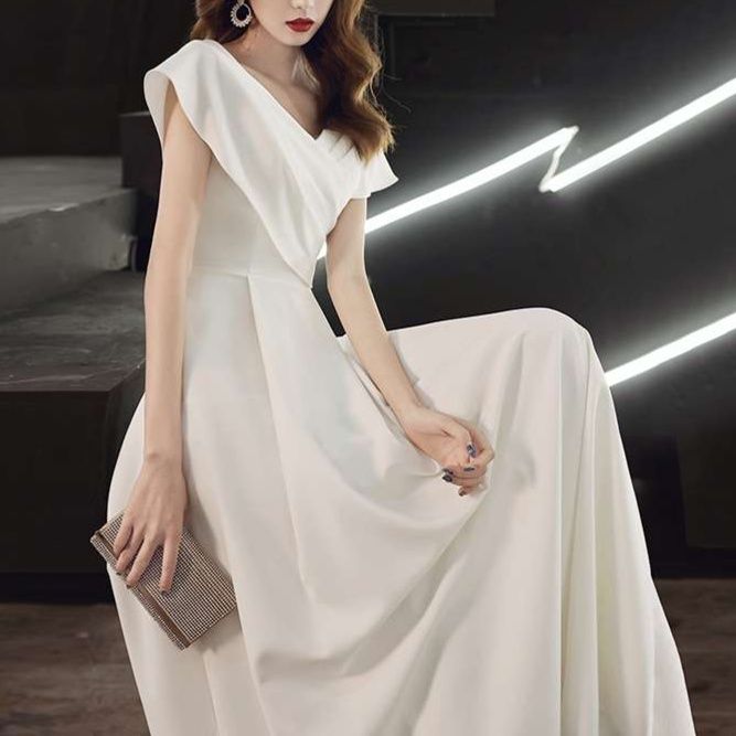 裾にかけて美しく流れるドレープラインが、動きに合わせて優雅な印象を与えます。