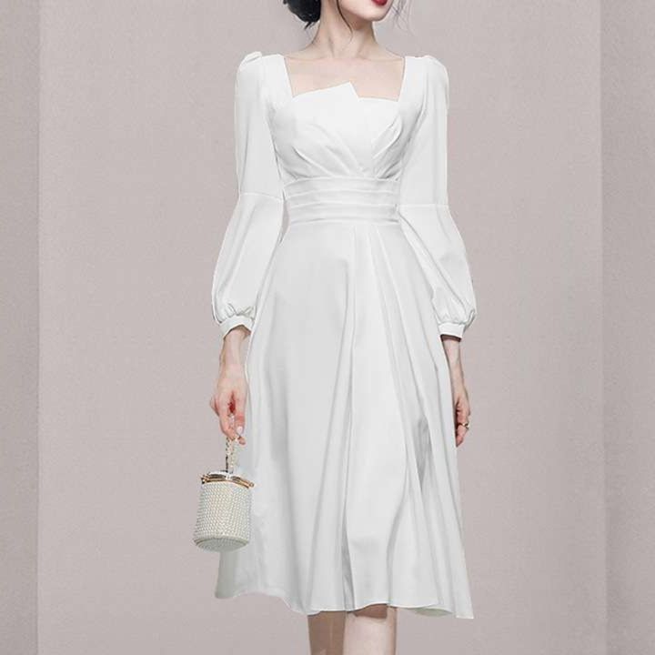 上品な印象の白ワンピース。スクエアネックラインと長めのパフスリーブが特徴的なミモレワンピ。