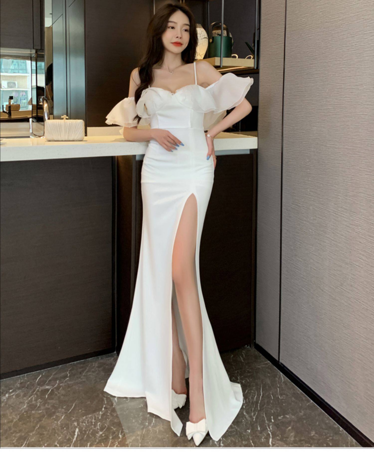 オフショルダーデザインとフリルが女性らしさを引き立て、サイドのスリットが入ったマーメイドラインが洗練された印象を演出。
